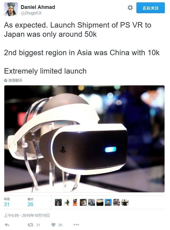 索尼新推出的PlayStation VR上市后在日本遭到疯抢,而这款主机在今年10月份也已登陆中国,且销量同样惊人,据推特上的爆料大神Daniel Ahmad爆料,PS VR在中国的销量是全亚洲仅次于日本的国家,仅仅6天突破万台,导致市场一度缺货。